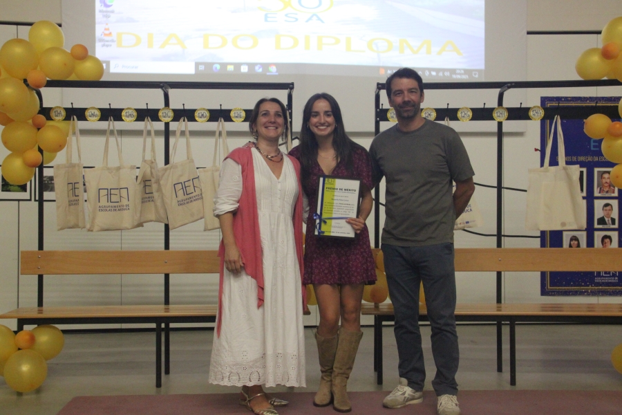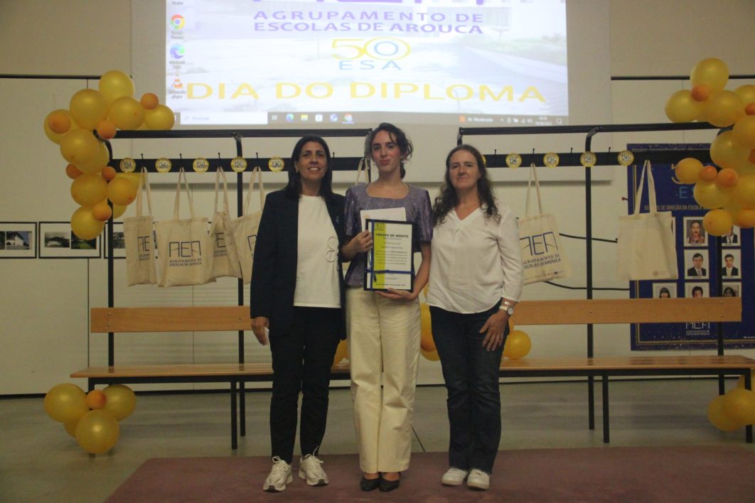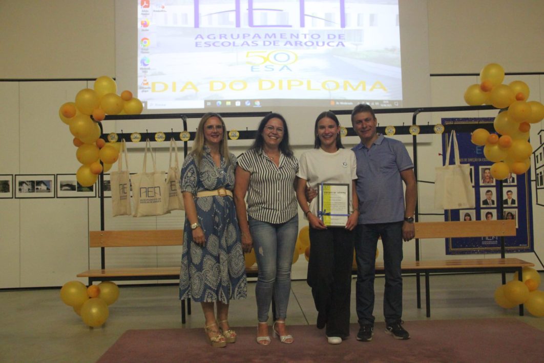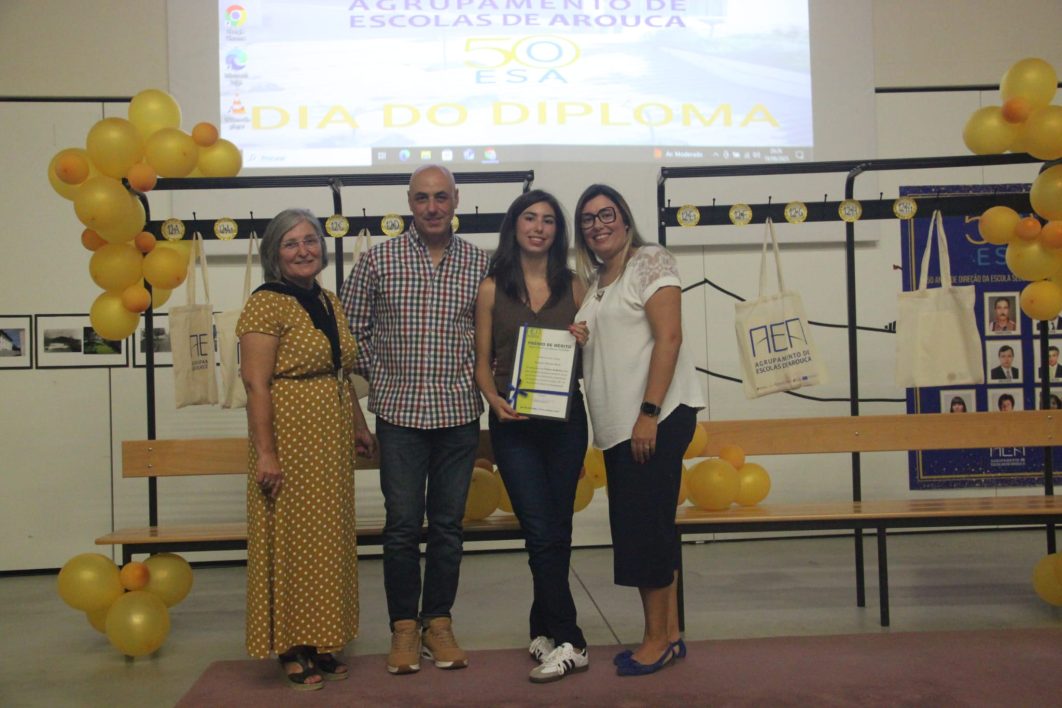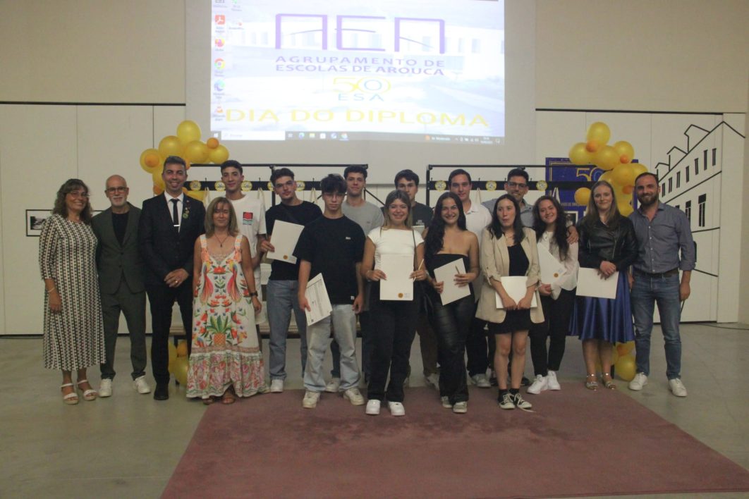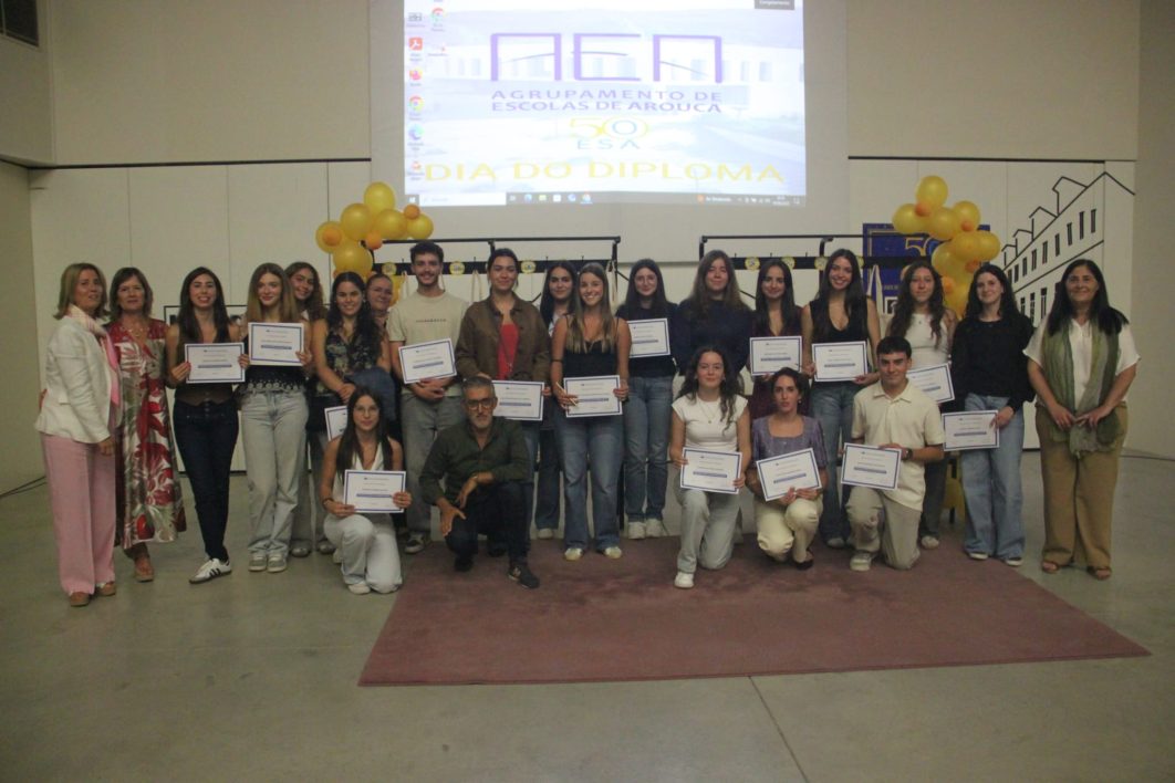A comunidade educativa do Agrupamento de Escolas de Arouca (AEA) reuniu-se para celebrar o Dia do Diploma, uma iniciativa de reconhecimento do sucesso escolar dos alunos que concluíram o ensino secundário no ano lectivo anterior e do mérito excepcional dos que mais se distinguiram pelo nível de resultados académicos e sociais. O Dia do Diploma, realizado a 19 de Setembro, contemplou uma centena e meia de alunos que concluiram os estudos de nível secundário. No momento festivo participaram os elementos da direcção, os directores de turma e os directores dos cursos profissionais, o presidente da Associação de Pais e Encarregados de Educação da ESA, José Pedro Gomes, a chefe dos Serviços Administrativos, Marta Vieira, o presidente da Associação de Estudantes, Guilherme Rodrigues, e os representantes das entidades parceiras da escola, que doaram os prémios atribuídos aos melhores alunos, nomeadamente as empresas Supermercado Meu Super Cavadinha, representada por Henrique Sousa, S&CC Portugal, representada por Marlene Soares, Caixa de Crédito Agrícola Terras de Santa Maria e a associação Rotary Club de Arouca, representada por Rosário Ferro. Em representação de outro dos parceiros da escola, o Município de Arouca, estiveram a vice-presidente da Câmara, Cláudia Oliveira, e o chefe da Unidade de Educação do Município, Mário Reis.