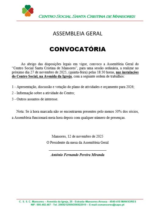 Ao abrigo das disposições legais em vigor, convoco a Assembleia Geral do “Centro Social Santa Cristina de Mansores”, para uma sessão ordinária, a realizar no próximo dia 27 de novembro de 2025, (quinta-feira) pelas 18:30 horas, nas instalações do Centro Social, na Avenida da Igreja, com a seguinte ordem de trabalhos: