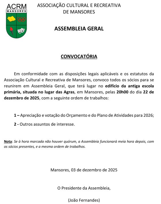 Em conformidade com as disposições legais aplicáveis e os estatutos da Associação Cultural e Recreativa de Mansores, convoco todos os sócios para se reunirem em Assembleia Geral, que terá lugar no edifício da antiga escola primária, situada no lugar das Agras, em Mansores, pelas 20h00 do dia 22 de dezembro de 2025, com a seguinte ordem de trabalhos:
