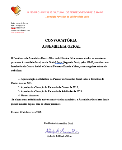 O Presidente da Assembleia Geral, Alberto de Oliveira Silva, convoca todos os associados para uma Assembleia Geral, no dia 30 de Março (Segunda-feira), pelas 18h00, a realizar nas Instalações do Centro Social e Cultural Fermedo Escariz e Mato, com a seguinte ordem de trabalhos: