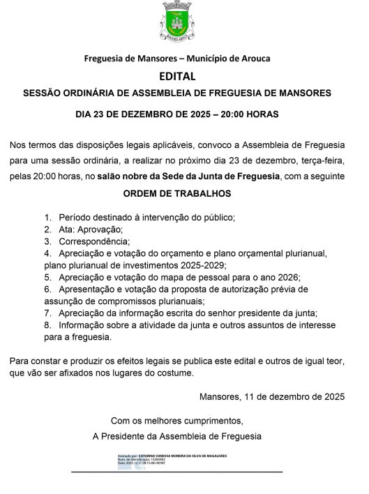 Nos termos das disposições legais aplicáveis, convoco a Assembleia de Freguesia para uma sessão ordinária, a realizar no próximo dia 23 de dezembro, terça-feira, pelas 20:00 horas, no salão nobre da Sede da Junta de Freguesia, com a seguinte