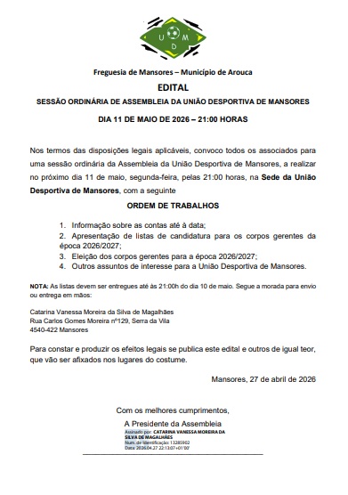Nos termos das disposições legais aplicáveis, convoco todos os associados para uma sessão ordinária da Assembleia da União Desportiva de Mansores, a realizar no próximo dia 11 de maio, segunda-feira, pelas 21:00 horas, na Sede da União Desportiva de Mansores, com a seguinte