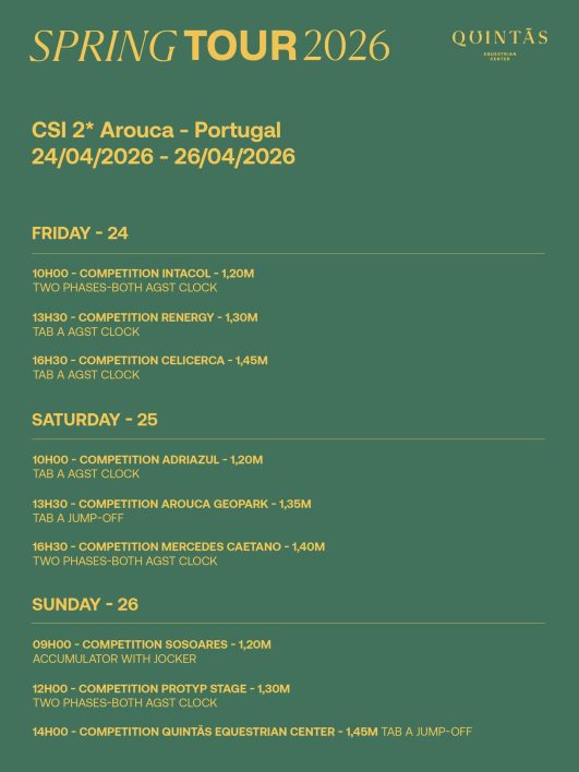 A primeira etapa do Spring Tour 2026 – Campeonato Internacional de Saltos – está já em marcha no Quintãs Equestrian Center, em Arouca. O evento hípico decorre de 24 a 26 de Abril (sexta-feira, sábado e domingo) e reúne cavaleiros nacionais e internacionais nesta fase da competição categorizada com duas estrelas, com um prize money de 82 000 euros.