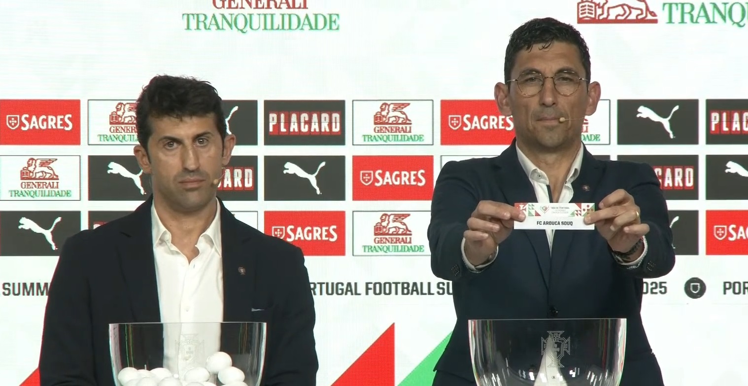 Cerca de mil e duzentos quilómetros é quanto o FC Arouca vai ter que percorrer para realizar o encontro da 3ª eliminatória da Taça de Portugal. O sorteio realizou-se esta quinta-feira na Cidade do Futebol (FPF) e colocou o Portimonense SAD na rota do FC Arouca. [Recorde-se que Portimão tem outro clube, o Portimonense SC, que disputa o Campeonato de Portugal-série D]. O sorteio contou com a presença dos antigos internacionais portugueses Marco Caneira e João Tomás, na foto, no momento da extração do FC Arouca.
